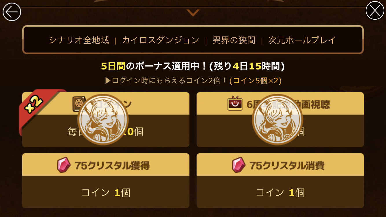 「75クリスタル獲得」と「75クリスタル消費」については、それをすれば繰り返し1コイン入手ができるため、済マークとしてアイリンの笑顔マークが付かない仕様というだけのようでした💦