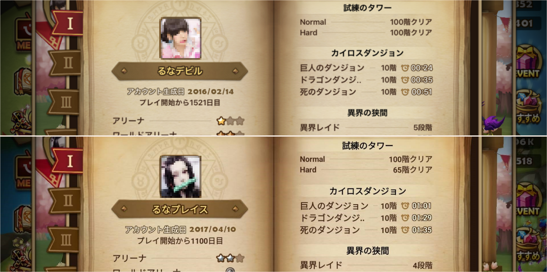 なぜならば自分は無課金で、メインアカウント、サブアカウントを(以前は3つめのアカウントもあって3つ同時に周回したりしてましたw)利用して下記のような長い日数をプレイしているんですけど、光闇の純正★5は一体もバチったことがないからですw