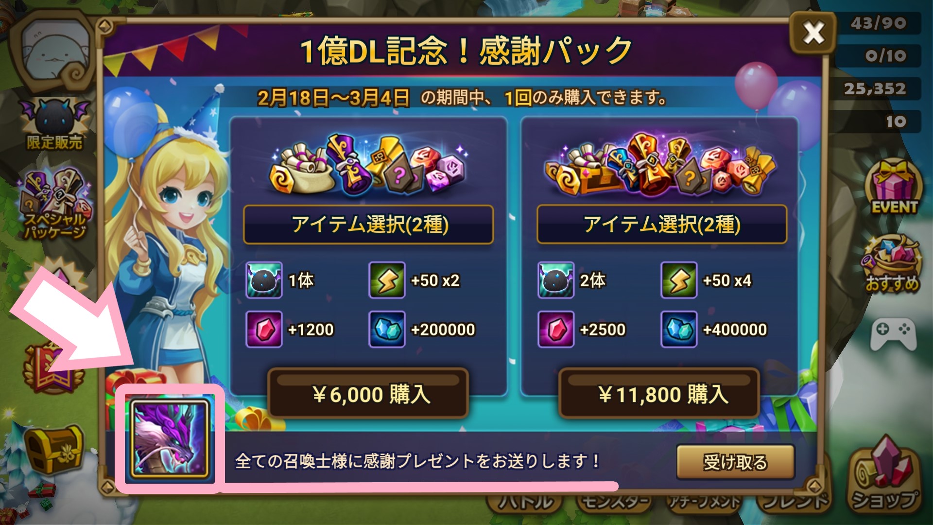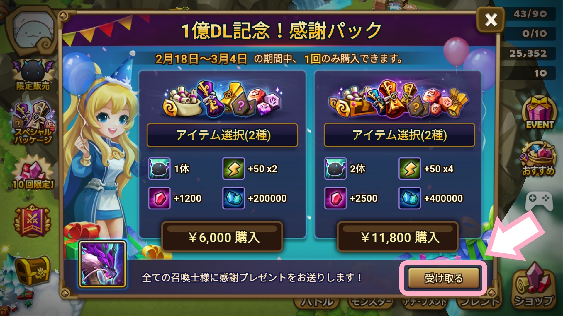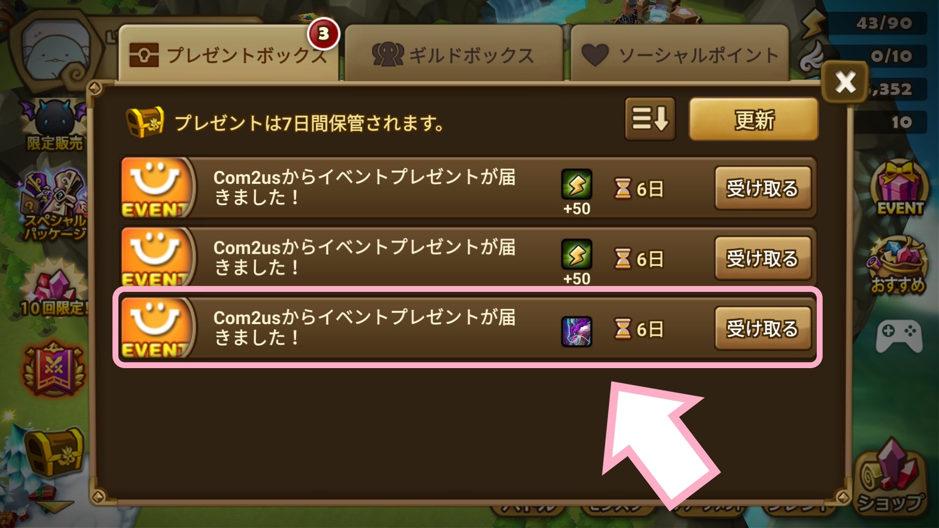 基本的には、ログインしたときに上記の画面が出てきたら、矢印⇙の[受け取る]ボタンをタップすれば受け取れるぜ☆