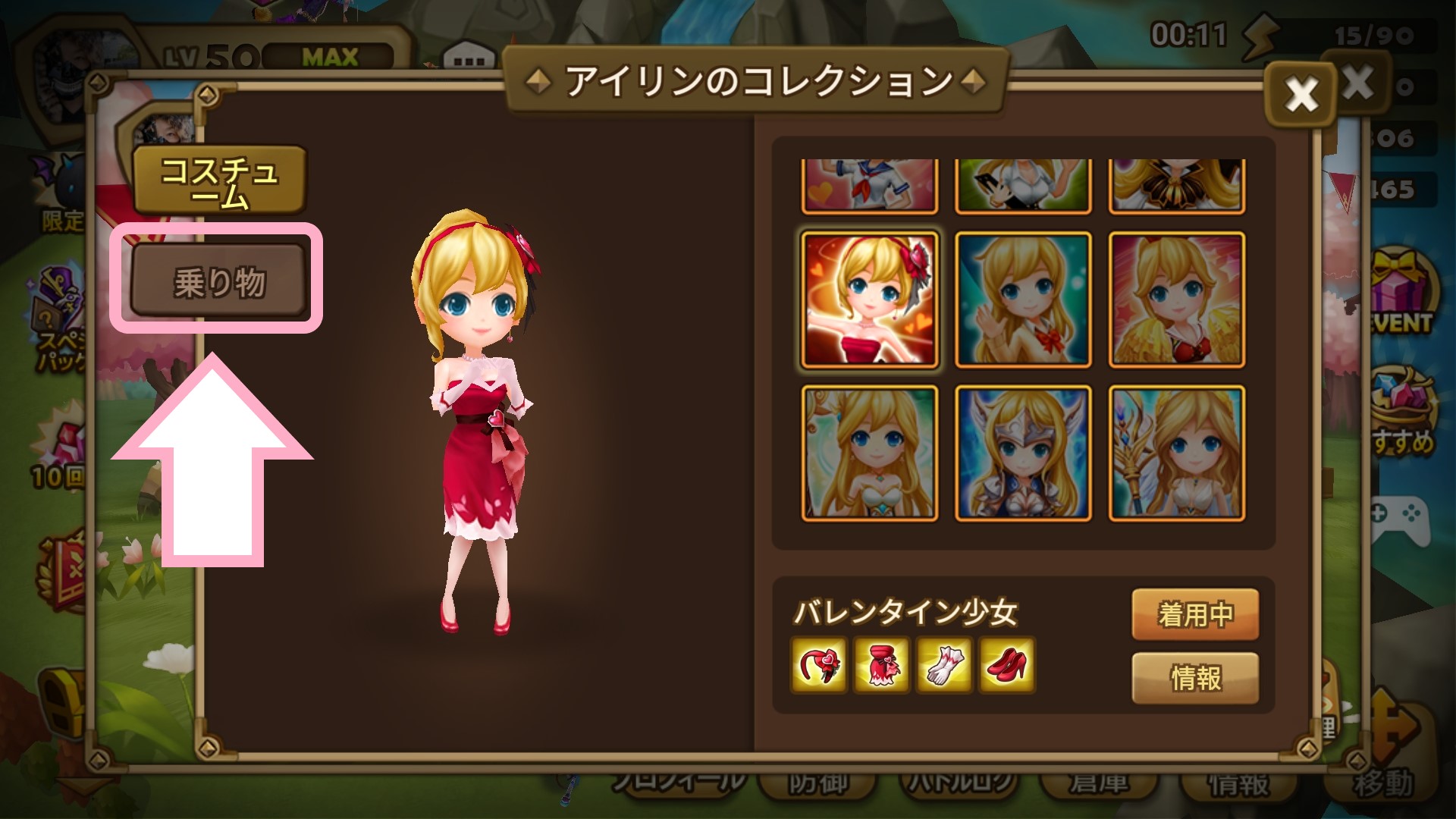 アイリンの「コスチューム」と「乗り物」の変更方法