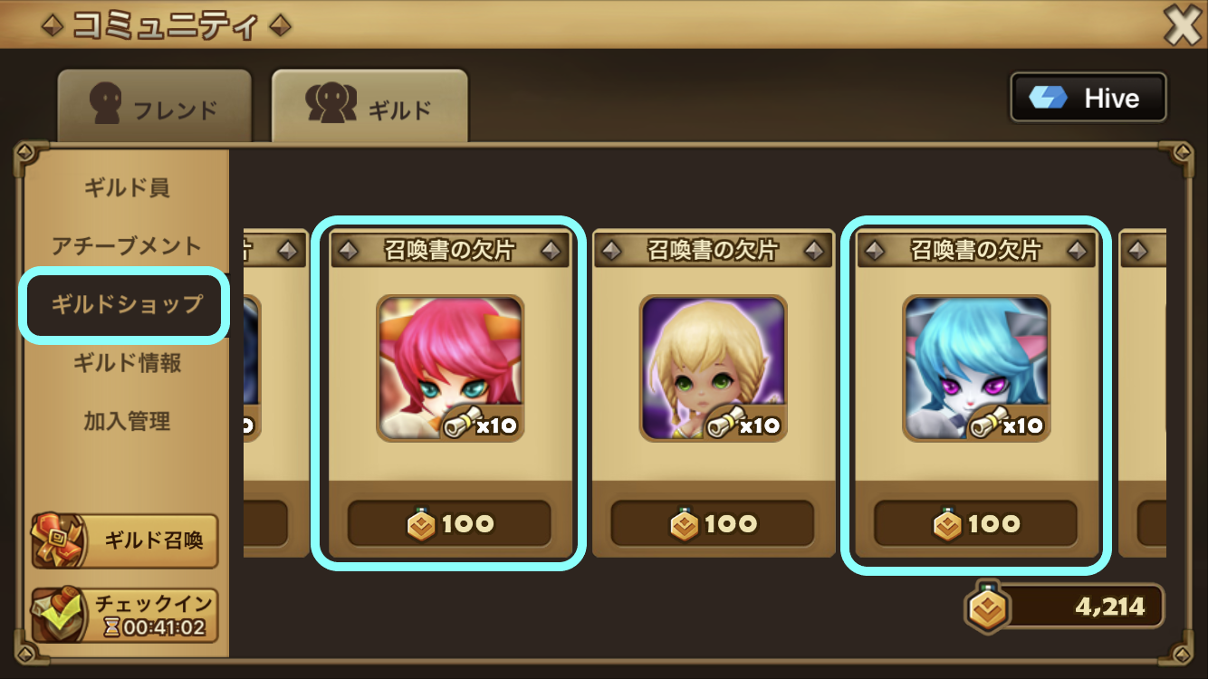 [フレンド⇒ギルド⇒ギルドショップ]でギルドポイントと水属性マーシャルキャットの召喚書の欠片を交換できる。