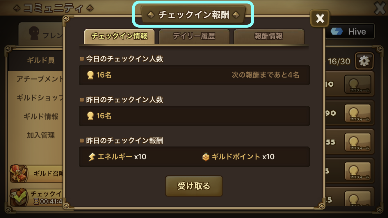 ギルドチェックイン報酬は前日のチェックイン人数に応じて報酬内容が決まる。