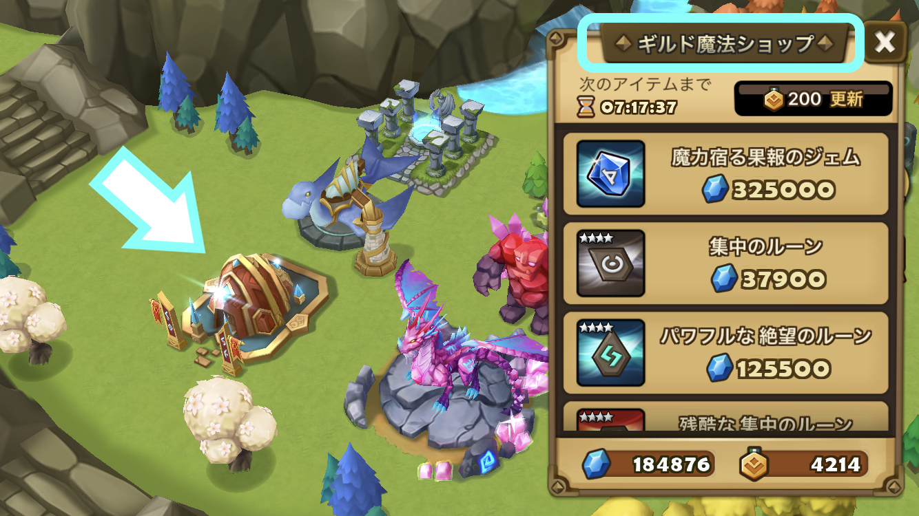 [フレンド⇒ギルド⇒ギルドショップ]でギルドポイントと水属性マーシャルキャットの召喚書の欠片を交換できる。