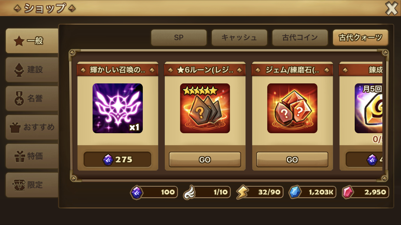 「輝かしい召喚の祝福」の入手には「古代クォーツ」が必要なんだよな。