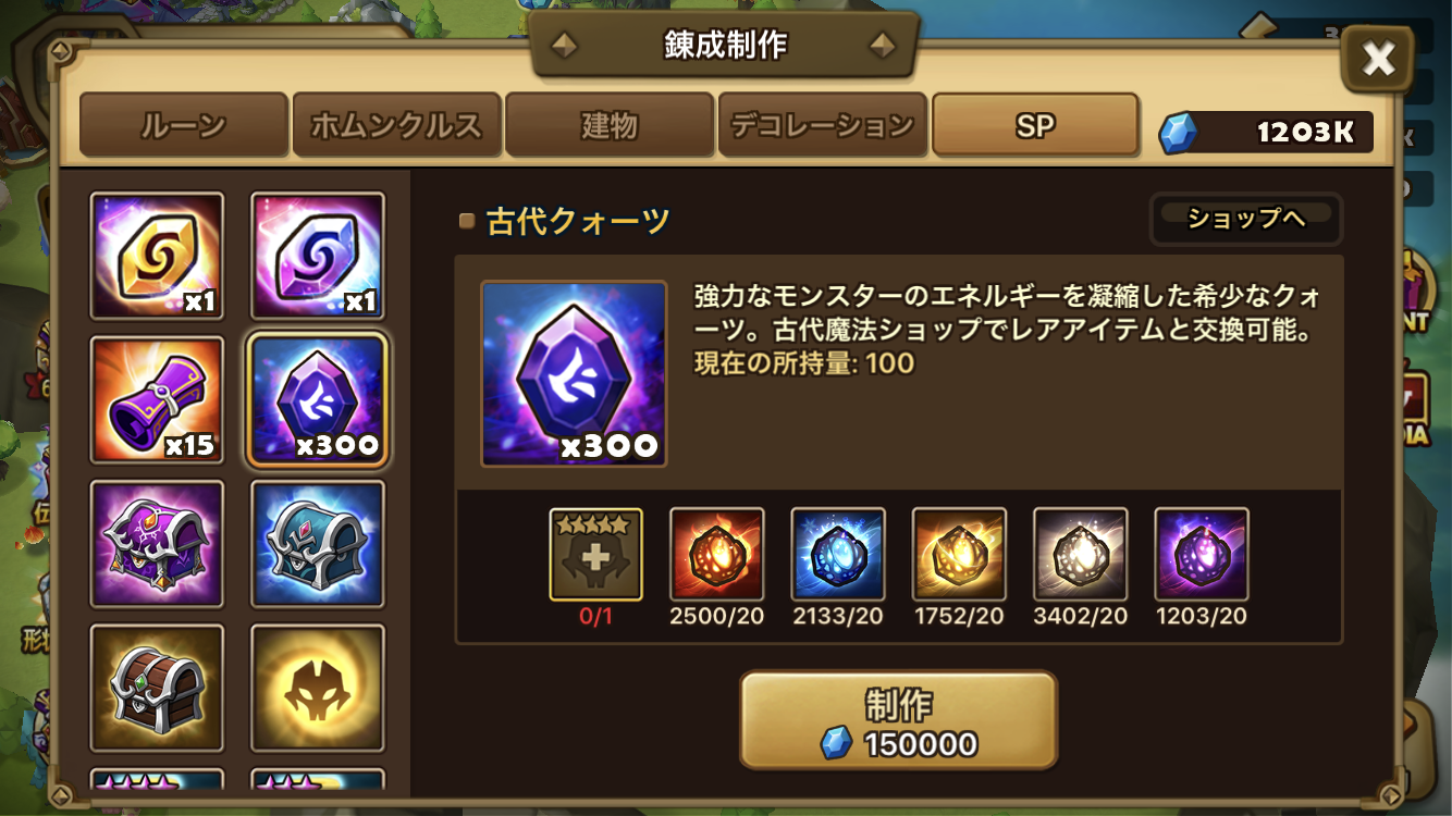 ⇩「古代クォーツ」の作成には純正★5モンスター(まだ★6にしてないモンスター)と各素材が必要。