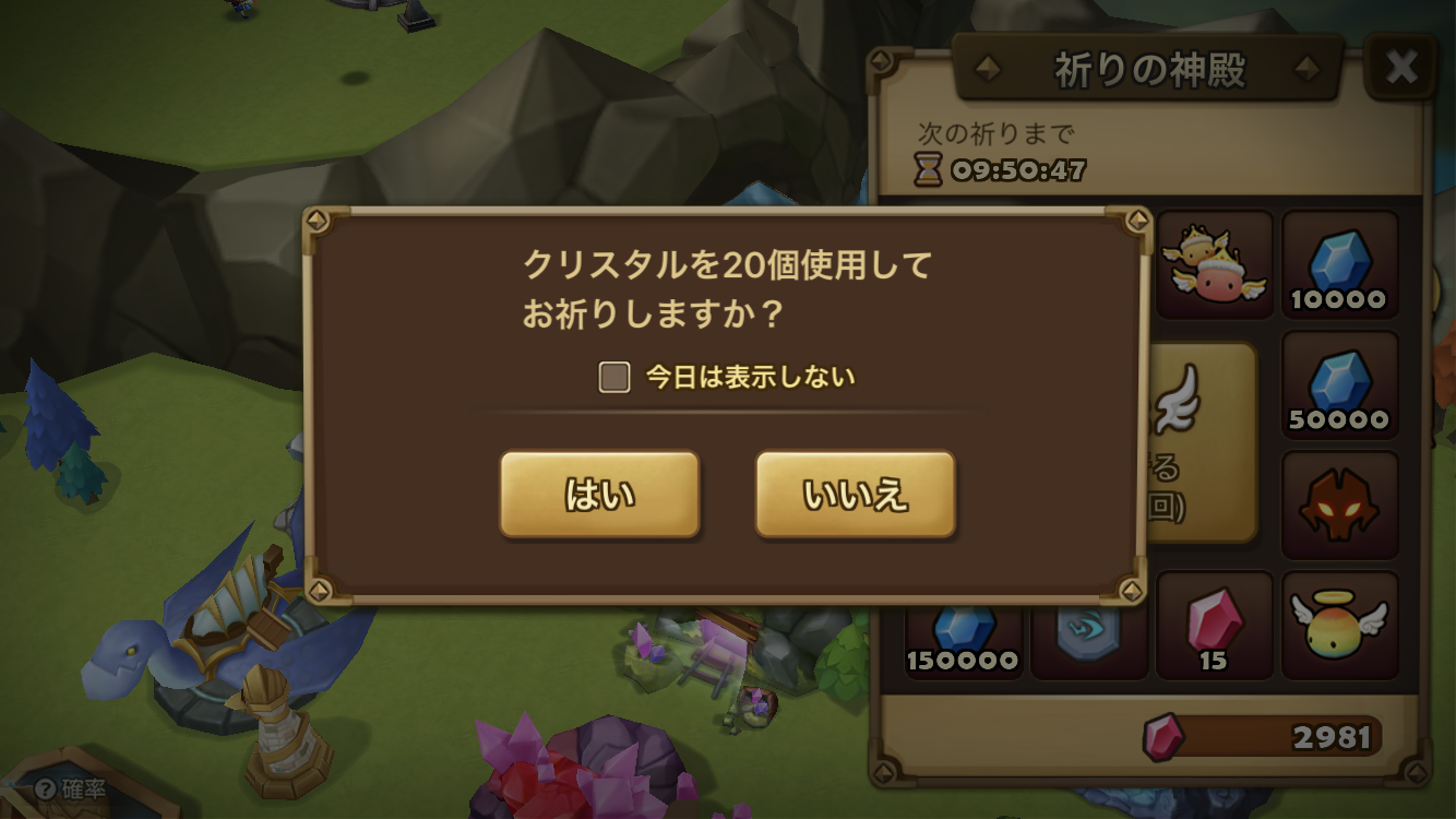 祈りの神殿で、追加で祈るには、マナストーンではなくクリスタル20個が必要ですね。