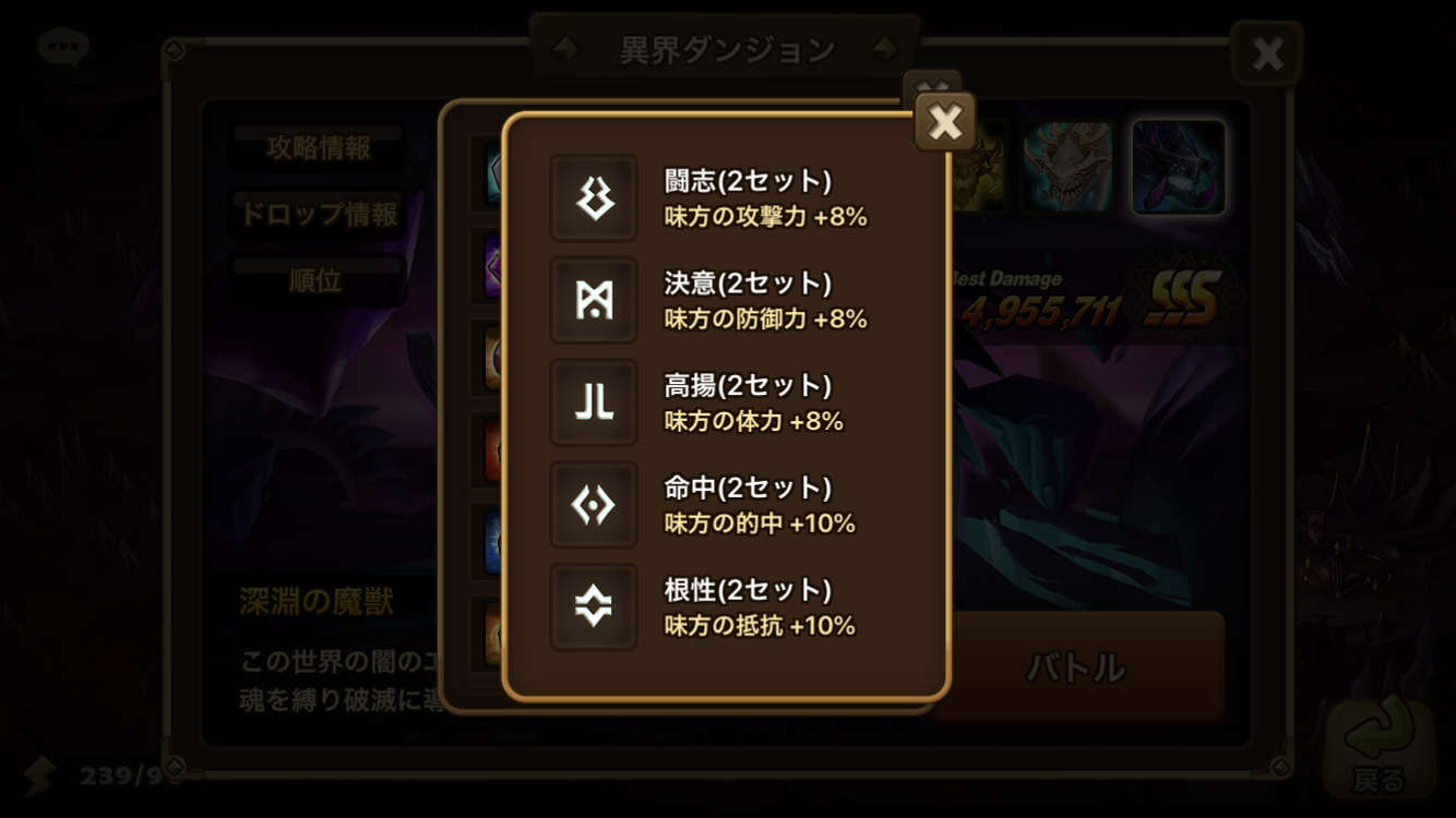 異界ダンジョンのバトルで[闘志/決意/高揚/命中/根性のルーン]を獲得できる。(異界レイドを除く)