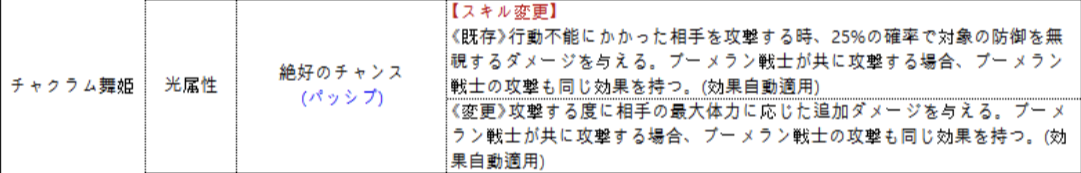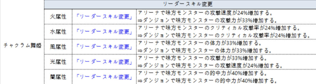 リーダースキルは全属性のチャクラム舞姫が変更になっているよ。